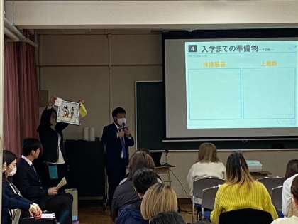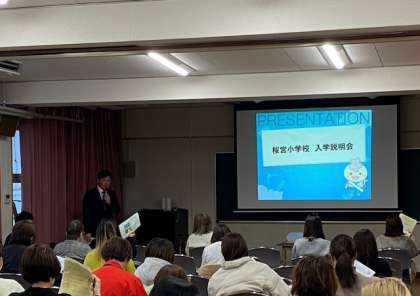 桜宮小学校の行事や取組のこと、入学式のこと、入学にあたって準備していただくもの、給食や事務手続きなど、さまざまなお話をさせていただきました。