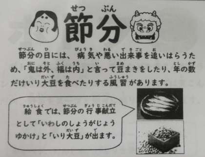 節分の日には、病気や悪い出来事を追いはらうため、「鬼は外、福は内」と言って豆まきをしたり、年の数だけいり大豆を食べたりする風習があります。給食では、節分の行事献立として「いわしのしょうがじょうゆかけ」と「いり大豆」が出ます。
