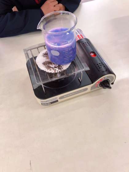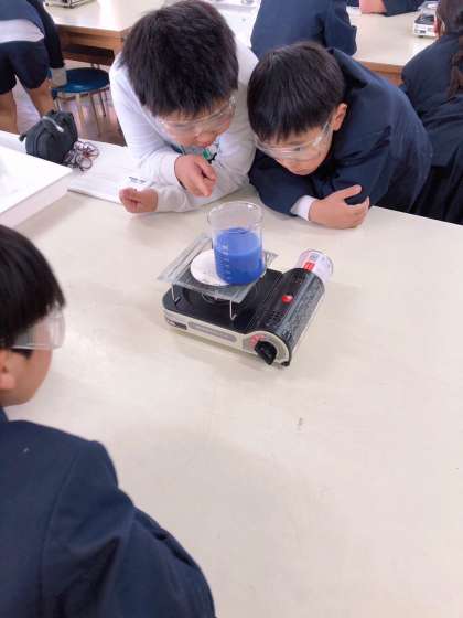 理科「もののあたたまり方」では、ビーカーの中の水のあたたまり方について実験しました。今までの実験結果から班で予想を立てて実験を行ったことで、あたためられた水の部分が上に動いた様子から金属のあたたまり方との違いに気づくことができました。