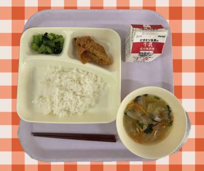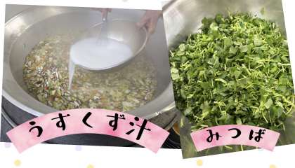 うすくず汁とは、葛という植物から取った葛粉でとろみをつけた汁物のことです。とろみのついた汁物は冷めにくく、体を温めてくれます。今日の給食では葛粉の代わりに片栗粉を使っています。