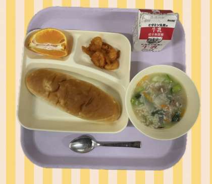 水を多めの水でやわらかく煮た料理を「かゆ」といいます。中華がゆは、味付けしたスープで米を煮てります。給食の中華がゆは、米のほかに肉だんご、チンゲンサイ、だいこん、にんじん、しいたけが入っています。