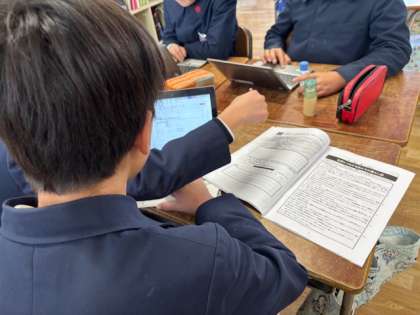 それぞれの班にわかれて活動をしています。資料を読みとり、わからないことなどをタブレット端末で調べています。来週には各班で発表をしてもらいます!完成が楽しみです。