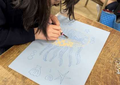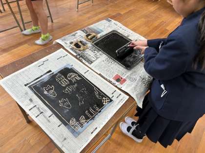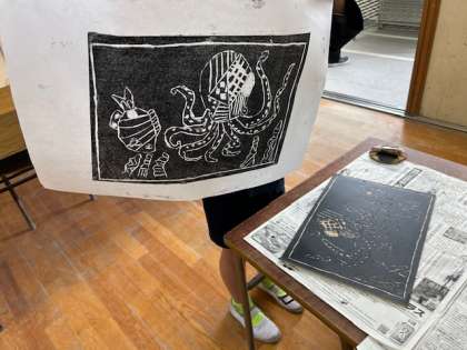 海の中の生き物をテーマに版画制作をしました。初めて使う彫刻刀にも慣れ、細かい部分まで丁寧に彫ることができました。インクをのせて刷り、一人ひとりの個性が光る素敵な作品が完成しました。