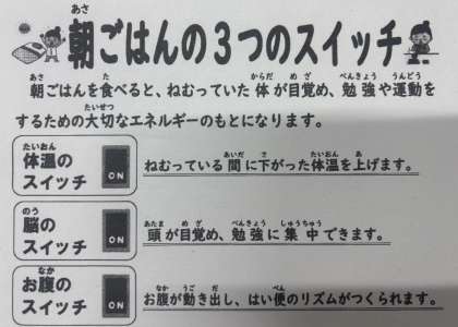 今日から給食が始まりました。教室では毎日校内放送を通して、当日の献立の話をしたり、児童のみなさんに伝えたい食育のお話をしています。今日は「朝ごはん」について紹介しました。朝ごはんを食べると、ねむっていた体が目覚め、勉強や運動をするための大切なエネルギーのもとになります。