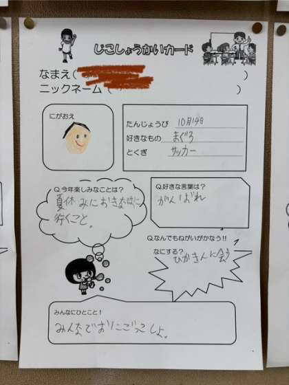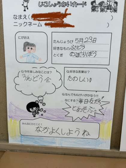 自己紹介カードです。今年一年が楽しくなるようにみんなにメッセージも添えています。ぜひ参観の際にご覧ください。