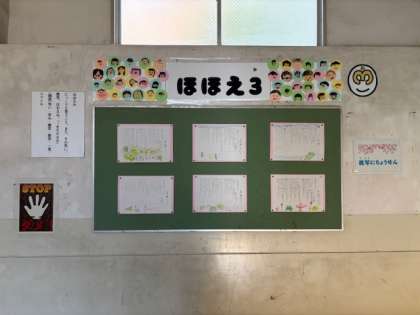 学年掲示も完成しております。来校された際はぜひご覧ください。お子さまの『ほほえ3』を探してみてくださいね!