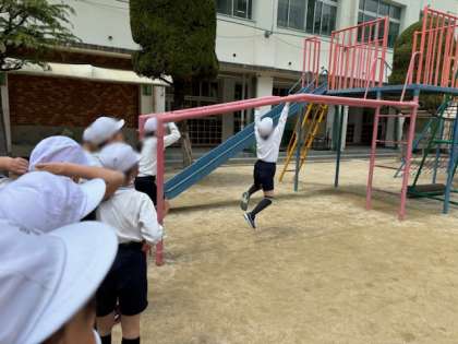 5年生合同の体育では、運動場で体力テストに向けた体力アップに取り組んでいます。握力や腕の力を意識しながらの鉄棒や登り棒の練習、投げるフォームや距離を意識したソフトボール投げの練習に、汗ばみながら意欲的に取り組む子どもたちの姿が見られました!