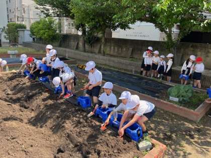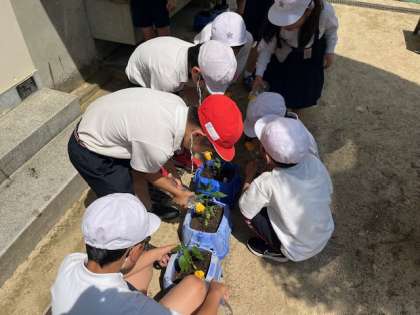 生活科の学習で野菜の苗を鉢に植えました。土を入れ替え、苗を丁寧に鉢に植えることができました。これから水やりを忘れることなく、大切に育てていきたいですね!