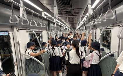 専用列車のため、車内は貸切状態で安心です。交代で座り合いながら向かっています。会場に到着が10:20の予定です。