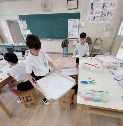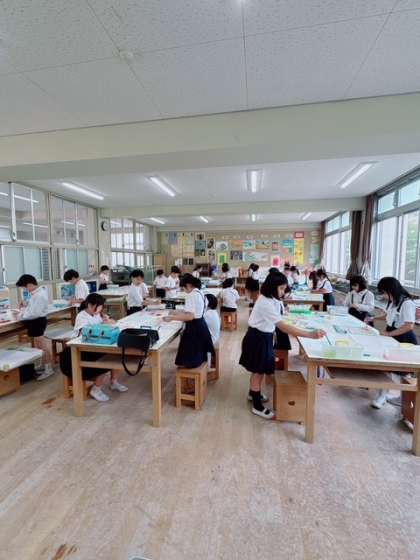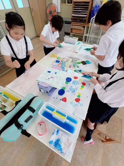 図画工作科「ぎゅうぎゅうにつめこむと」では、スパッタリングやドリッピンクなど様々な技法を使い、画用紙に模様を描くことができました。
