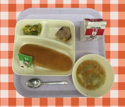 旬の食べ物を味わってもらうために、給食でも季節ごとに旬の食材が出てきます。5月の給食では、かわちばんかん、たけのこ(大阪府産)、レタス、グリーンアスパラガス、わかめなどが出ました。