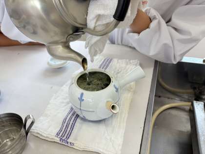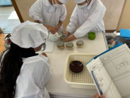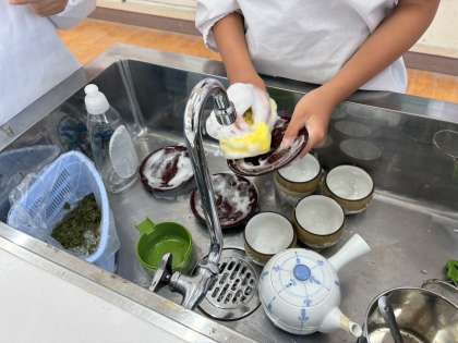 家庭科の授業では、初めての調理実習を行いました。家庭科室の使い方を確認したり役割分担をしたりして、協力して煎茶を入れることができました!「苦いけど美味しい!」と感想を伝えながら味わいました。