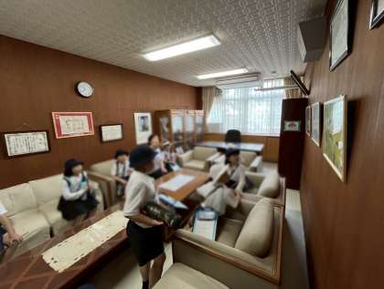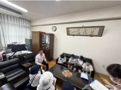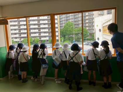 「町たんけん」では、幼稚園や中学校などにも行きました。子どもたちは久しぶりの幼稚園を懐かしんだり、初めて行く中学校に緊張したりした様子でした。園児や中学生とも関わる機会もあり、楽しく見学することができました。