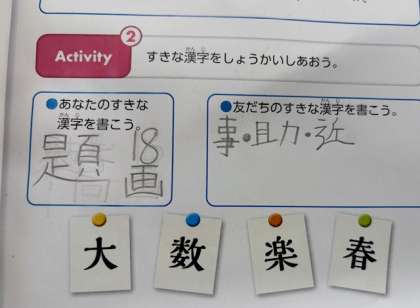 今日の外国語活動では自分の好きな漢字を書き、画数を英語で伝え合いました。20までの数字はもうばっちりですね!お家でもぜひ言ってみましょう!