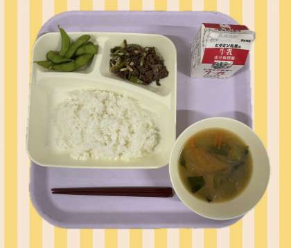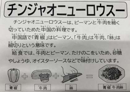 チンジャオニューロウスーは、ピーマンと牛肉を細く切っていためた中国の料理です。中国語で「青椒(チンジャオ)」はピーマン、「牛肉(ニューロウ)」は牛肉、「絲(スー)」は細切りという意味です。給食では、牛肉とピーマン、たけのこをいため、砂糖やしょうゆ、オイスターソースなどで味つけしています。
