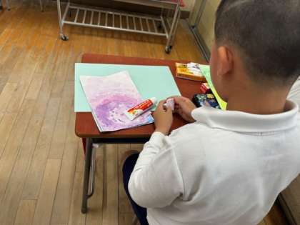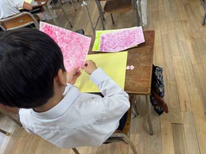 3年生は図画工作科で千切り絵に挑戦しています。綺麗な色のアジサイができるようにみんな集中していました。完成が楽しみですね!