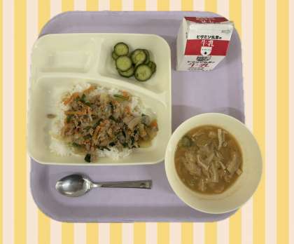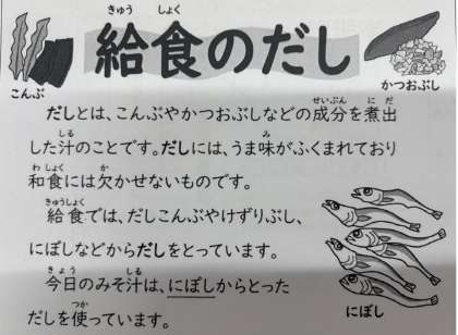 だしとは、こんぶやかつおぶしなどの成分を煮出した汁のことです。だしには、うま味がふくまれており和食には欠かせないものです。給食では、だしこんぶやけずりぶし、にぼしなどからだしをとっています。今日のみそ汁は、にぼしからとっただしを使っています。