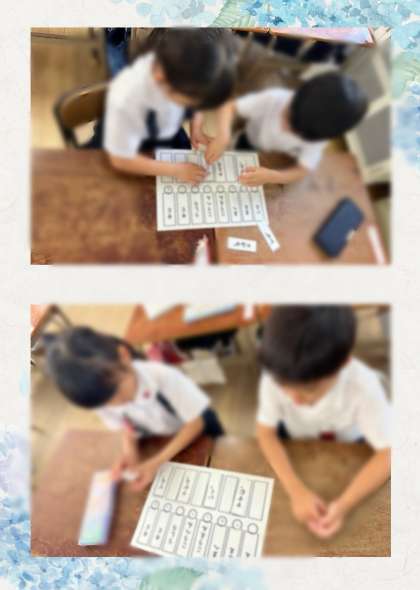 「こっちは おにぎりの お!」「を は まんなかに くるね!」と隣のお友だちと相談をしながら、カードを並べて正しい文を作っていました。