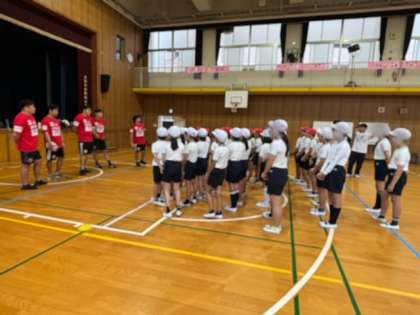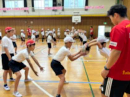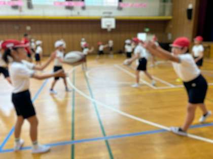 今日は、ラグビーチーム『レッドハリケーンズ大阪』の皆さんに来ていただき、ラグビーの授業を行っていただきました。はじめに、ボールの持ち方を教えていただき、初めてラグビーのボールを持ってわくわくする子ども達の姿が印象的でした。パスの動きでは、相手に思いやりを持って優しくパスすることを意識して、楽しくパスをつなぐことができました。