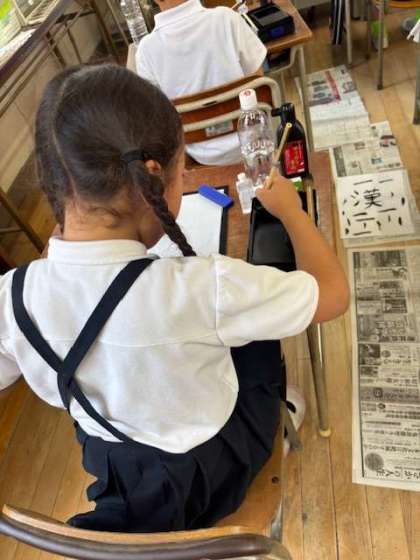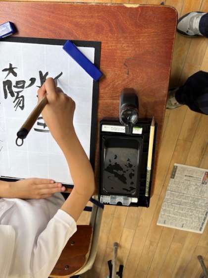 今日は初めての毛筆の授業がありました。活動の中でのルールや片付け方など、様々なことを学びました。一度半紙に線などを書いてみました。難しかったですね!集中してよく頑張りました!!!