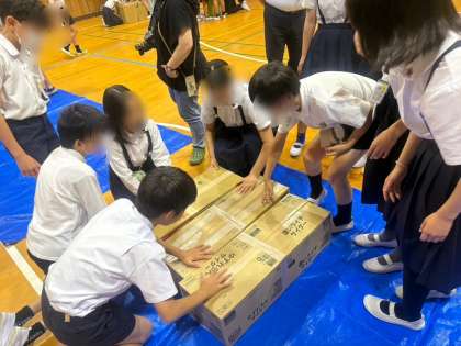 その後はダンボールベッドの作成の体験をしました。もしもの時に避難所にあるものでできるだけ快適に過ごせる方法をみんなで考えました。