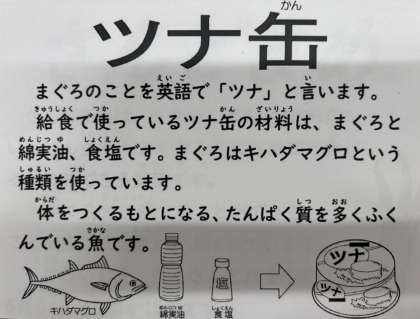 まぐろのことを英語で「ツナ」と言います。給食で使っているツナ缶の材料は、まぐろと綿実油、食塩です。まぐろはキハダマグロという種類を使っています。体をつくるもとになる、たんぱく質を多くふくんでいる魚です。