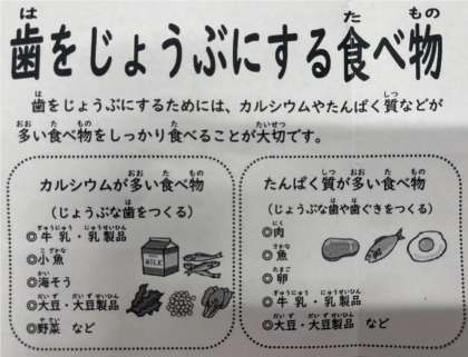 歯を丈夫にするためには、カルシウムやたんぱく質などが多い食べ物をしっかり食べることが大切です。カルシウムは丈夫な歯をつくり、たんぱく質は丈夫な歯や歯茎をつくることに役立ちます。カルシウムが多い食べ物は、牛乳・乳製品、小魚、海藻、大豆・大豆製品、野菜などです。たんぱく質が多い食べ物は、肉、魚、卵、牛乳・乳製品、大豆・大豆製品などです。