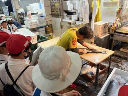 広い広い市場の中を見学しながら、競り体験や鮮魚の解体見学、市場の歴史についての展示コーナーの自由見学など様々な体験をさせていただきました!