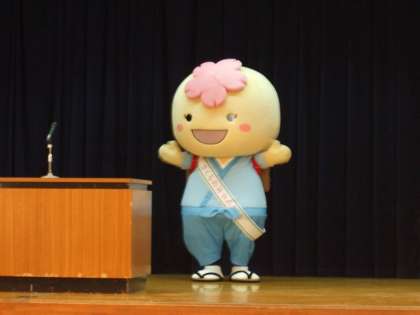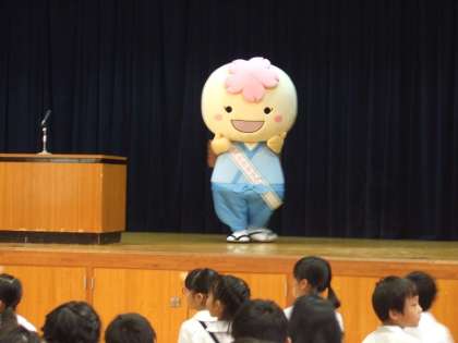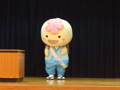 7月20日(水)午前9時から、講堂で第1学期の終業式を行いました。3年の発表、校長先生のお話、生活指導の注意と続きました。そして、最後に校歌を歌い終わったところで、「桜っこ」が駆けつけてくれました。