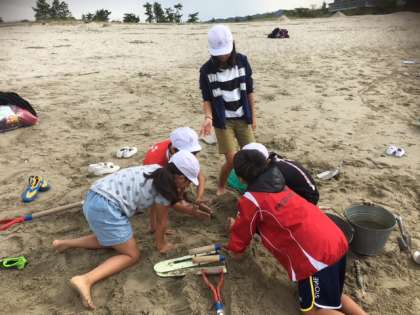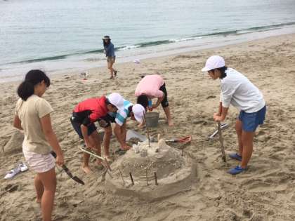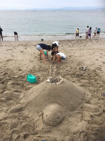 砂の造形の途中経過です。どんどんユーモアたっぷりの作品が姿を現しはじめています!!