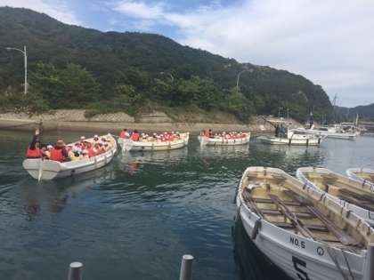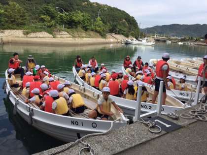 午後のメインイベント!カッターの乗船を体験をしました。どのチームも声をかけ合い、力いっぱいこぎました!!