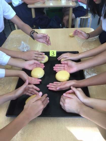 パンの生地をこねてガス抜きをしたり、クッキー生地をのばして包んだりとみんな真剣に作業をしています!