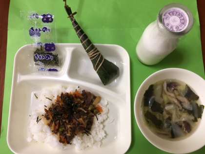 1年生ではちょうどちまきを食べる頃に、6年生がお手伝いにきてくれて大助かり!ちまきを巻いていたひもを少しだけといてもらい、あとは上手に自分でとりながら笹の葉をむき、食べることができました。「もちもちしておいしい!」「あまくておいしい!」「はじめて食べたよ」と少し早いこどもの日の献立にとてもうれしそうでした。