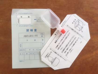 本日,お手紙の他に,「尿検査セット」を配っています。1.尿検査袋2.検尿容器3.検尿カップの3種類です。お家でご確認ください。