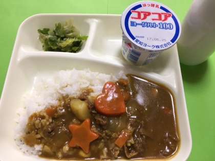 給食に出てくるカレーの種類はいろいろあります。今日は牛肉だけではなく、大豆も入ったカレーライスでした。にんじんはハートの形、ほしの形のラッキーにんじんがたくさん入っていました。「ちょっと苦手だけど、少し食べてみよう!」とチャレンジしていた児童もいて、どのクラスも残食ゼロでした。