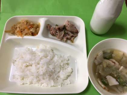 今日の給食は、・豚肉の梅風味焼き ・すまし汁 ・切り干しだいこんのいため煮 ・ごはん ・牛乳の献立でした。