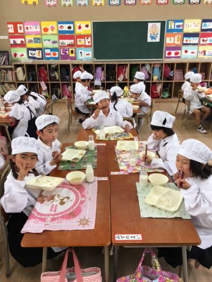 「今日の豚肉の献立には○○を入れておいしく仕上げています。さて、何を入れているでしょう」の質問に、子ども達はしっかりとあじわいながら、「ピーマン!」「にんじん?」「あぶら」「さとう」最後に思い出したように「うめ!」とようやく正解が出ました。豚肉と細切りしたピーマンに砂糖、料理酒、こい口しょうゆ、梅肉を合わせて下味をつけて焼き物機で焼いています。子ども達にも大変好評でしたので、ご家庭でも一度おためしください。