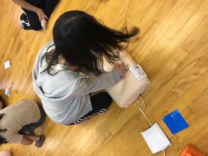 救命処置で最も大切なのは、早く救急車の要請をすること、胸骨圧迫を長く続けることです。そのために、一人ではなく複数で処置する練習もしました。写真は、胸骨圧迫の実技をしているところです。