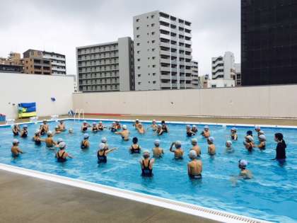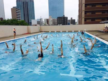 シンクロナイズドスイミングは、普段、水深3mのプールで行うものですが、橘雅子さんは、水深1mほどの学校のプールで、みごとな演技を披露してくださいました。