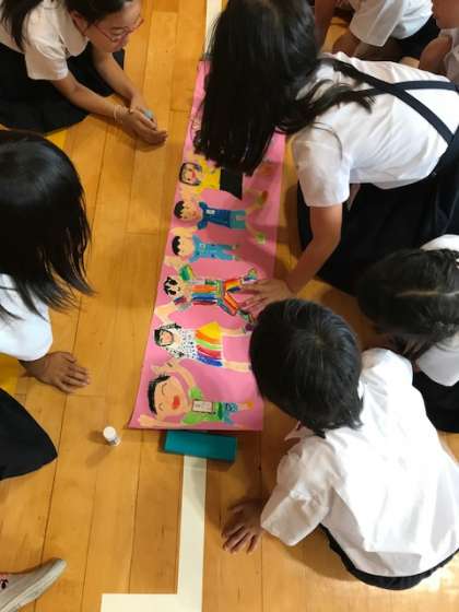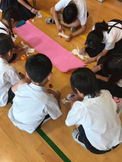 7月6日(木)の児童集会は各ファミリーごとに今年の手つなぎ人形を作成しました。
