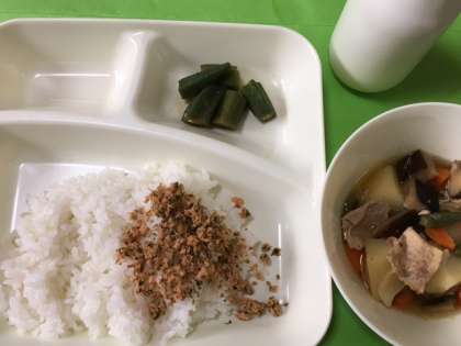 今日の献立は、・豚肉とじゃがいもの煮もの・オクラのかつお梅風味・紅ざけそぼろ・ごはん・牛乳でした。1学期の給食は本日で終了です。