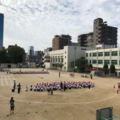 9月21日(木)の児童集会は運動場で、運動会で行う午後の部の応援合戦の練習をしました。