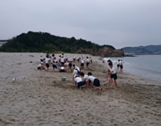 宿舎のすぐ側の砂浜で、グループごとに砂で立体作品を作りました。海水で砂を固めながら、どのグループも楽しそうに作っていました。