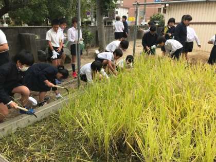 そこで、学習園で育てていた稲をみんなで刈りました。鎌で刈って束にして、ピロティに干しています。