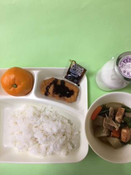 今日の給食は・まぐろのフライ・豚肉とあつあげの煮もの・みかん・ごはん・牛乳でした。
