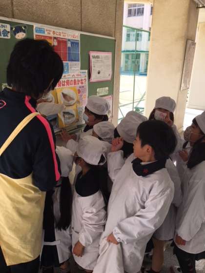 「今日のまぐろは大きなお魚だよ」「トンカツソースつけて食べるんだね」「あっ!大好きなみかんもついてるよ」と給食カレンダーと職員室の前の栄養黒板を見て確認していました。