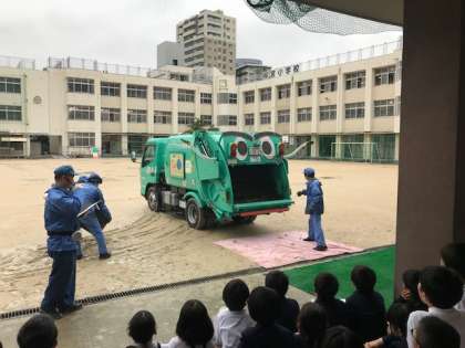 5月7日(月)、あいにくの雨でしたが、2時間目になかよし学級前の広場でパッカー車体験をしました。大阪市環境局北部環境事業センターの方々をお招きして、パッカー車についての説明と実際にゴミを収集する体験をしました。