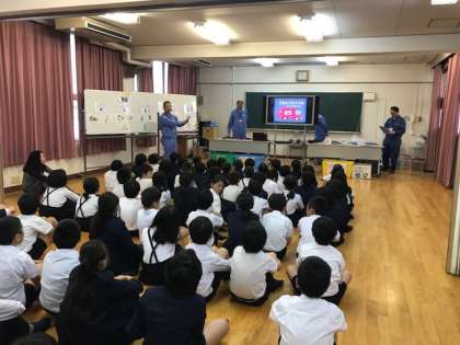 3時間目は、多目的室にてゴミの分別についてのお話のあと、実際に班に分かれてゴミ分別をしました。子どもたちは帽子は何ゴミになるのか、ちょっと難しかったようでした。