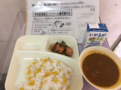 ・さけのちゃんちゃん焼き ・とうもろしごはん ・スープカレー ・牛乳でした。