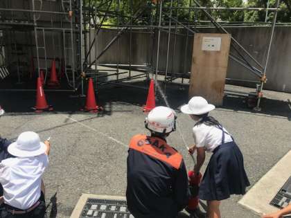 最後に、実際に火災現場で使う消防道具や、救助車、はしご車などの消防自動車を見学し、水消火器を使って消火体験をしました。